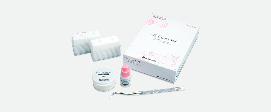 2液タイプの知覚過敏抑制材「MSコート」の高い知覚過敏抑制効果はそのままに操作性を追求したワンボトルタイプとなっています。